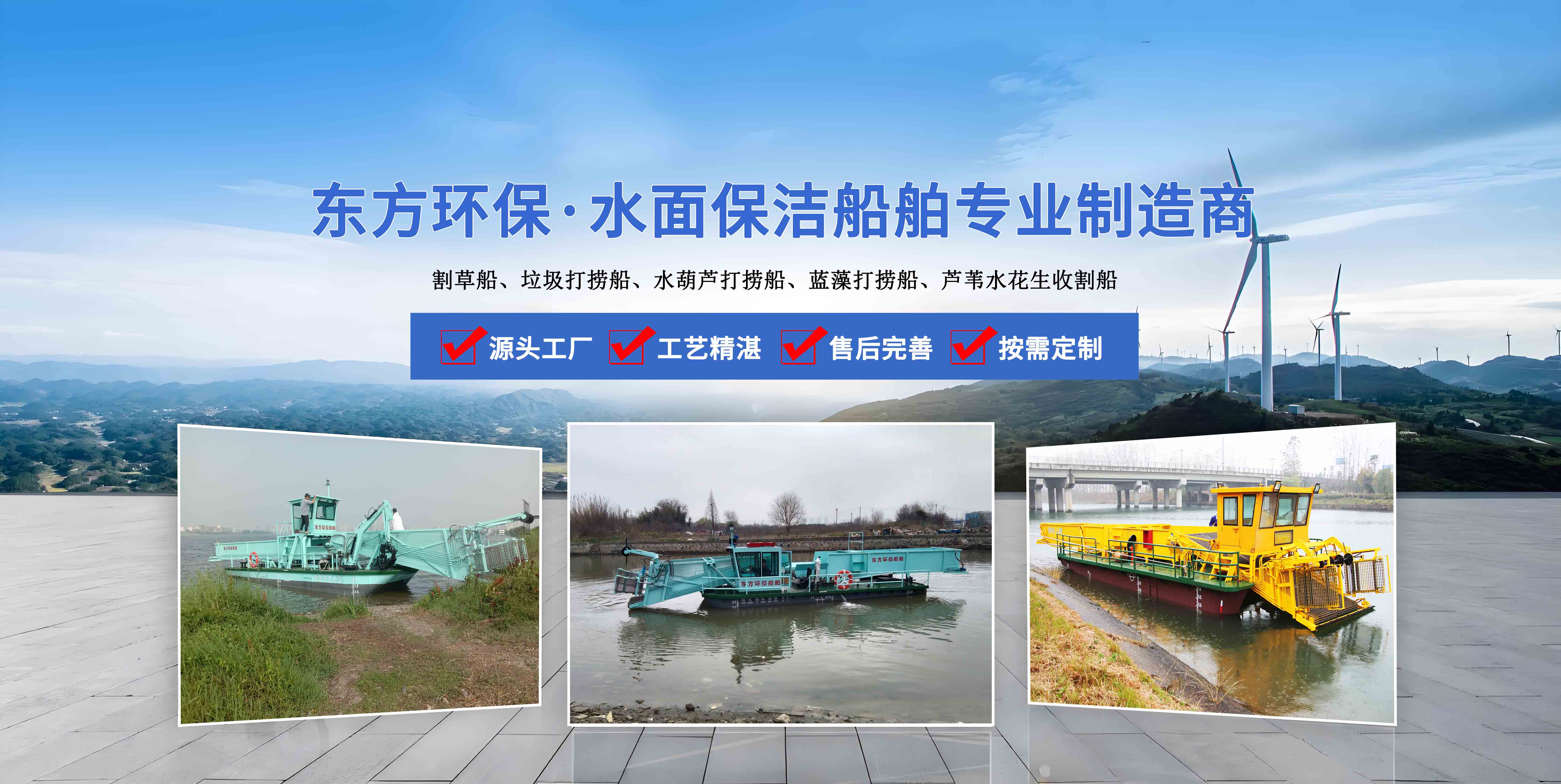 青州市東方環(huán)保機械制造有限公司位于山東省青州市,地理位置得天獨厚,是水面保潔船、水草收割船、、清漂船、滸苔打撈船、藍藻打撈船等水面船體的專業(yè)制造銷售廠家, 公司成立于2006年,公司先后與山東省黃河造船廠、中船重工702研究所、青島海洋大學(xué)、渤海船舶職業(yè)學(xué)院等機構(gòu)建立了長期合作關(guān)系.。